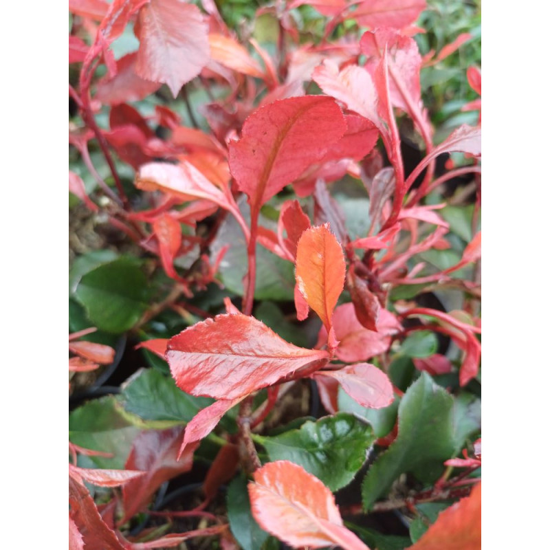 Zimozielona roślina o młodych czerwonych przyrostach.